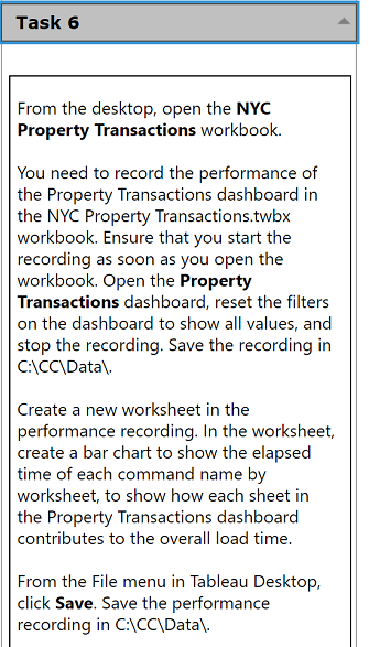 To record the performance of the Property Transactions dashboard in the NYC Property Transactions.twbx workbook and analyze it using a bar chart, follow these detailed steps: