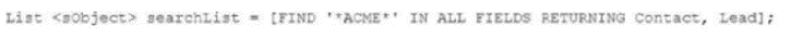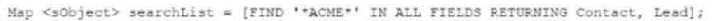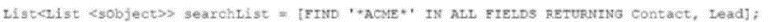 List<List<SObject>> searchList = [FIND 'ACME' IN ALL FIELDS RETURNING Contact, Lead];