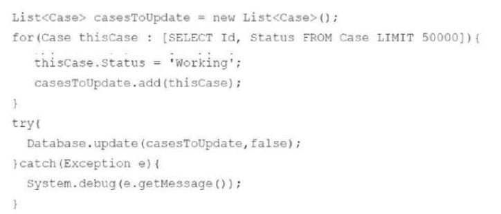 Why the Try-Catch Block Fails to Handle Limits (B & D):Governor limit exceptions (System.LimitException) cannot be caught by try-catch blocks. Therefore, the exception cannot be handled, and the transaction will fail.