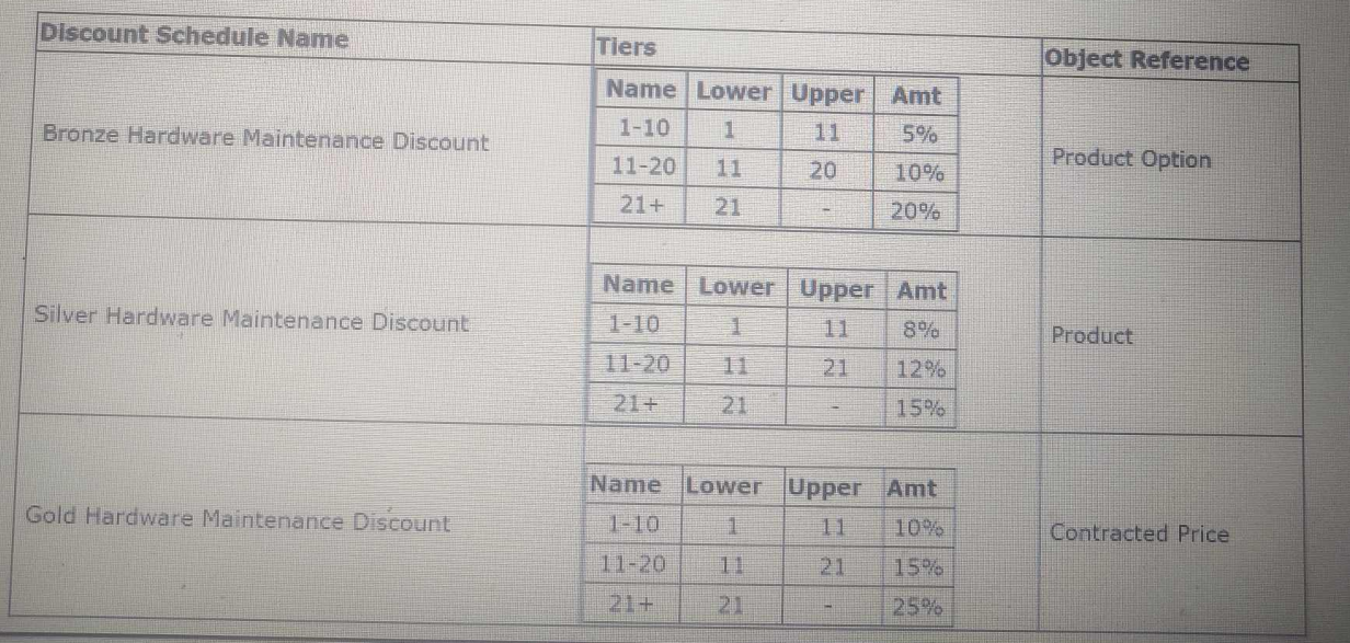 Universal Containers has three different range discount schedules. All three have a reference to Product A through the objects shown below. Product A is an option in a bundle and has a list price of $100.