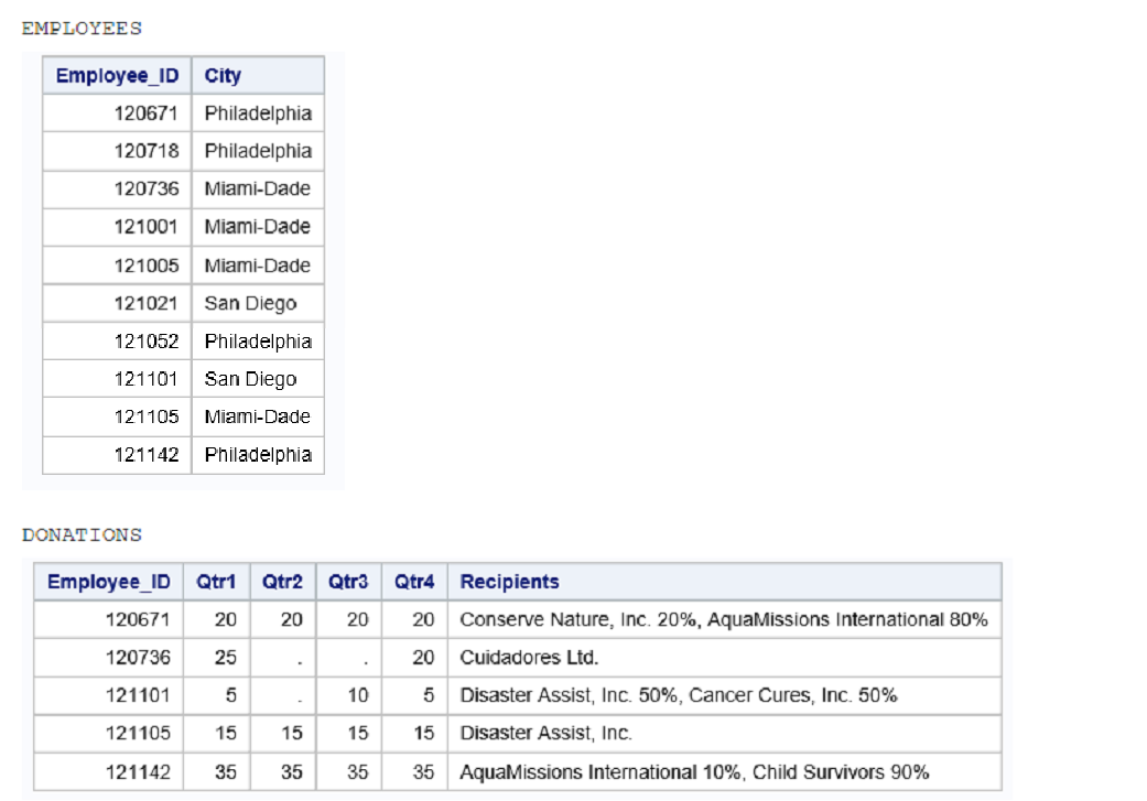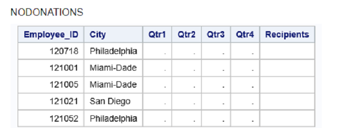 Given the input data sets EMPLOYEES and DONATIONS, and the output data set NODONATIONS below: