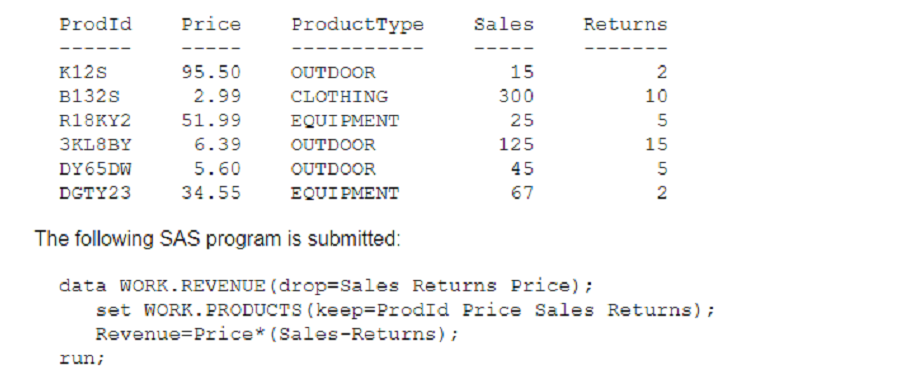 The resulting WORK.REVENUE data set contains 3 variables. In the provided SAS program, the set statement uses a (keep=) option to keep only 3 variables from WORK.PRODUCTS, which are ProdId, Price, and Sales. The drop= data set option in the data statement specifies to drop the Sales and Returns variables from the output data set. However, Returns was not included in the keep= option, so it won't be part of WORK.REVENUE to begin with. Finally, a new variable Revenue is calculated and included in the data set. Therefore, the final data set contains the variables ProdId, Price, and Revenue.