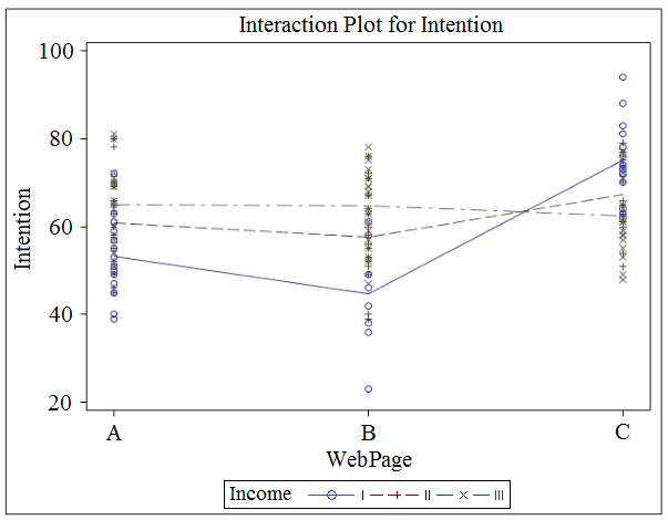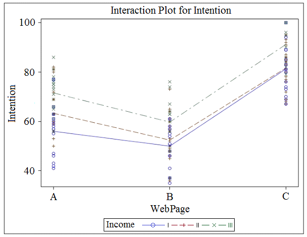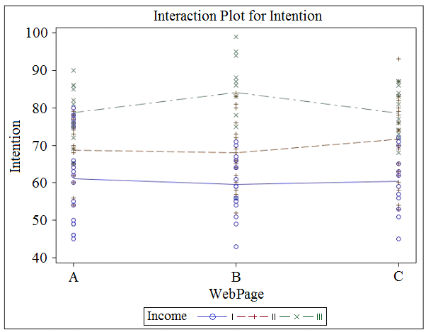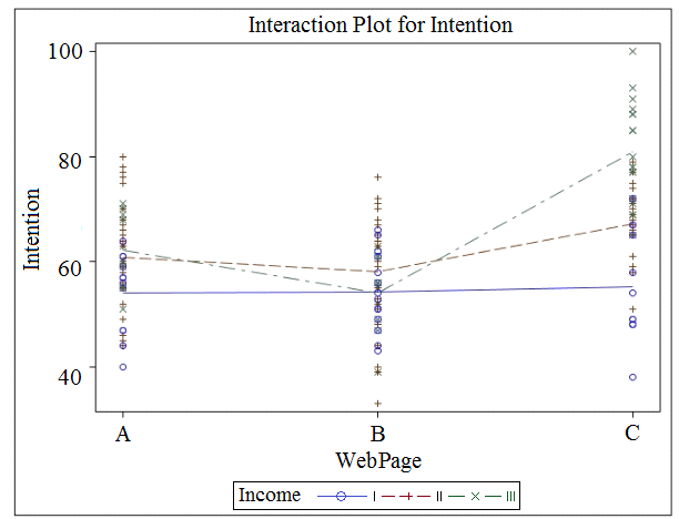 A marketing analyst assessed the effect of web page design (A, B, or C) on customers' intent to purchase an expensive product. The focus group was divided randomly into three sub-groups, each of which was asked to view one of the web pages and then give their intent to purchase on a scale from 0 to 100. The analyst also asked the customers to give their income, which was coded as: I (lowest), II (medium), or III (highest). After analyzing the data, the analyst claimed that there was significant interaction and the webpage design mainly influenced high income people.