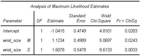 The following LOGISTIC procedure output analyzes the relationship between a binary response and an ordinal predictor variable, wrist_size Using reference cell coding, the analyst selects Large (L) as the reference level.