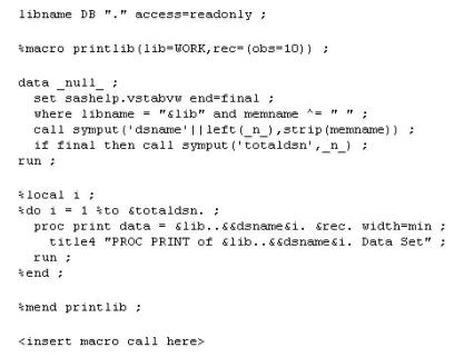 Which macro call prints all records from each dataset in library DB?
