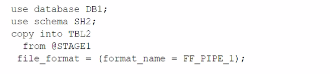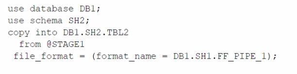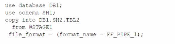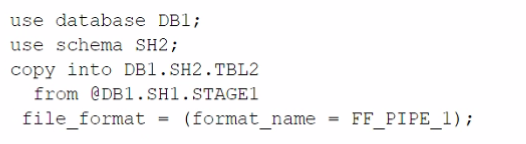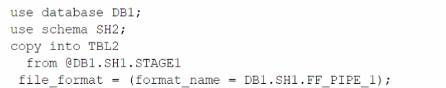 The architecture in the image shows a Snowflake data platform with two databases, DB1 and DB2, and two schemas, SH1 and SH2. DB1 contains a table TBL1 and a stage STAGE1. DB2 contains a table TBL2. The image also shows a snippet of code written in SQL language that copies data from STAGE1 to TBL2 using a file format FF PIPE 1.