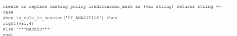Consider the following scenario where a masking policy is applied on the CREDICARDND column of the CREDITCARDINFO table. The masking policy definition Is as follows:
