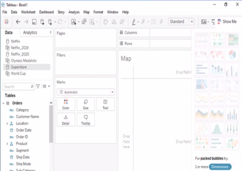 Open the link to Book1 found on the desktop. This will open the Tableau workbook that uses the Superstore data source.