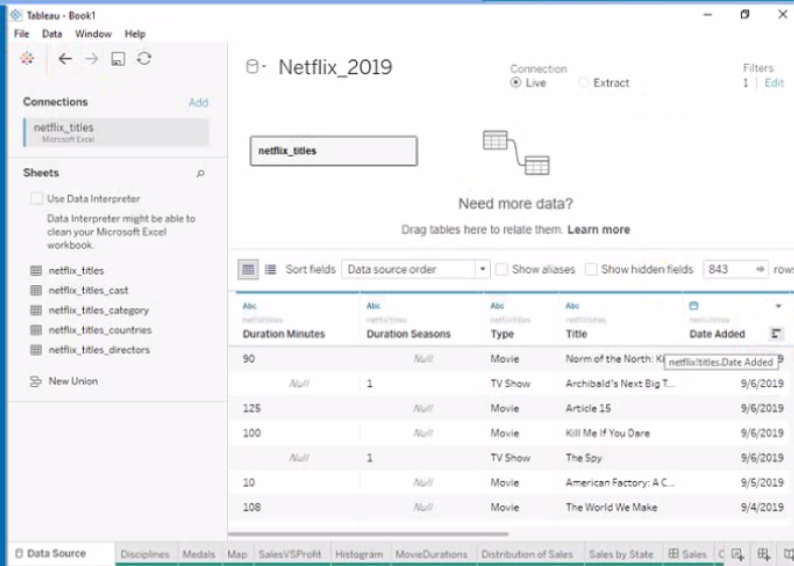 Open the link to Book1 found on the desktop. This will open the Tableau workbook that contains the Movie Durations worksheet.