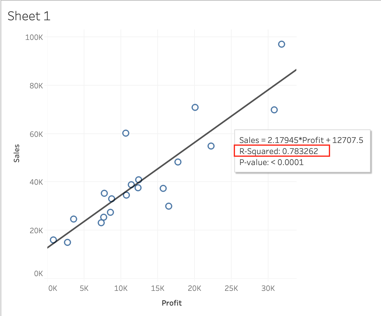 Using the CoffeeChain table, create a scatter plot of Profit (x-axis) vs Sales (y-axis) broken down by State. Add a Linear trend line to the view. What is its R-squared value?