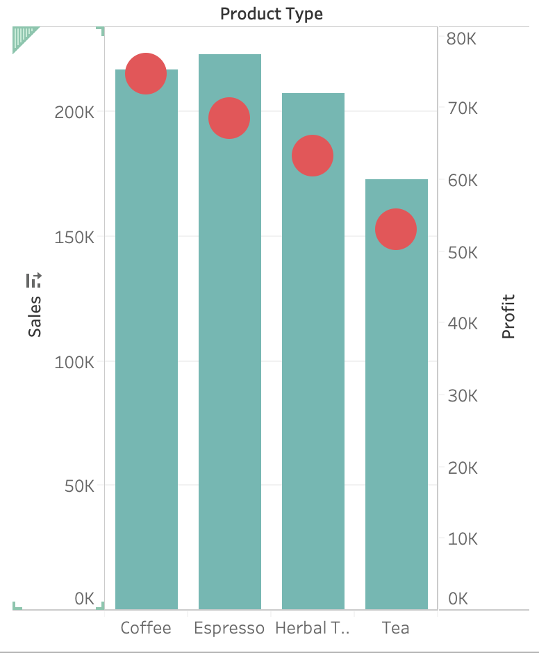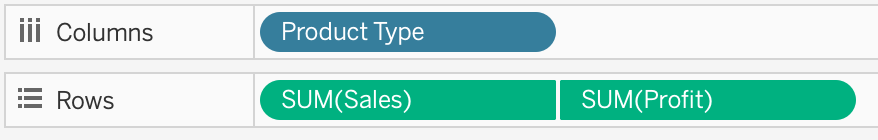 1) Drag Product Type to the column shelf, and Sales and Profit to the Row shelf: