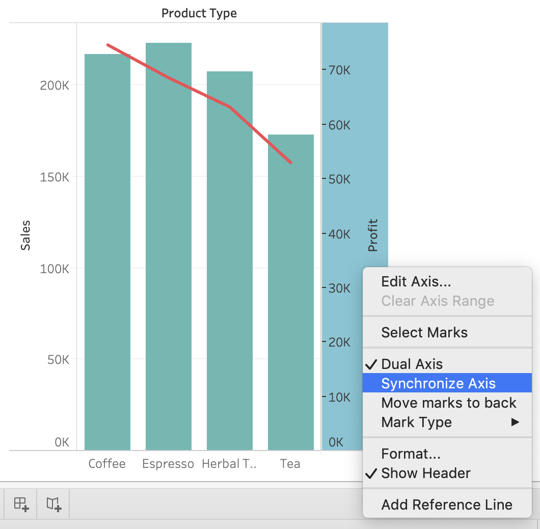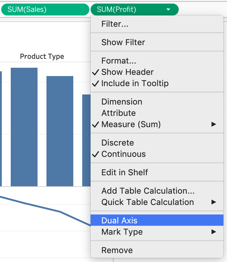 3) Now, click on the Profit pill in the Rows Shelf, and select dual axis:
