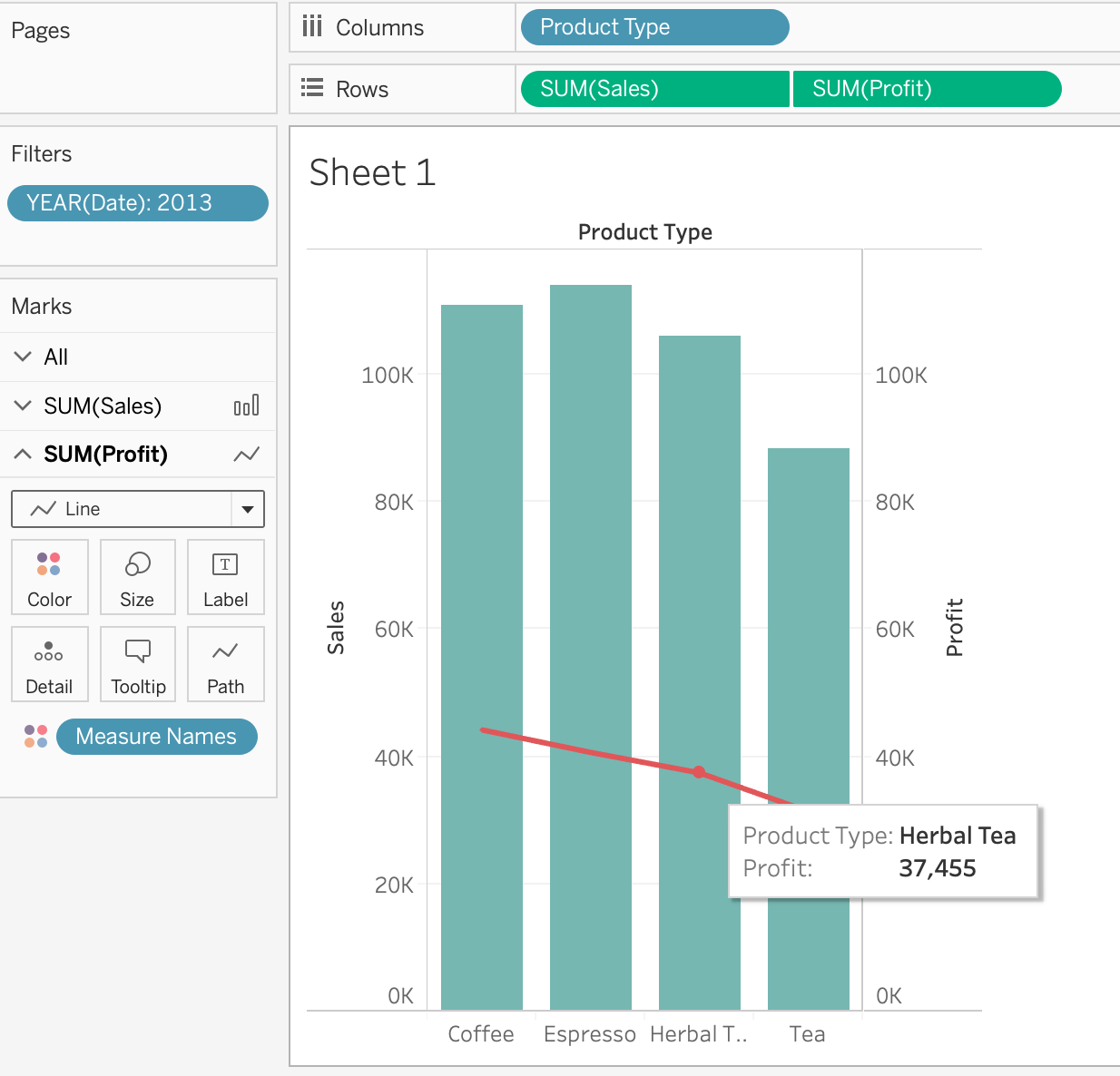 Using the CoffeeChain table, create a Dual Axis chart showing the Sales (Bar chart) and Profit (Line Chart) for each Product type. What was the Profit for the Herbal Tea product type in 2013?