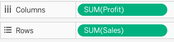 1) First drag Sales to the Rows shelf and Profit to the Columns shelf: