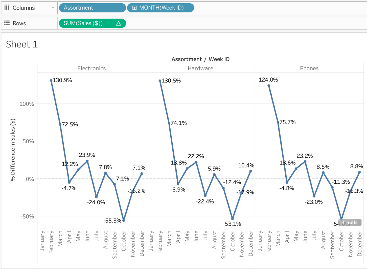 1) Drag Assortment and Year ID (choose Discrete Month) to Columns shelf, and Sales to the Columns Shelf.
