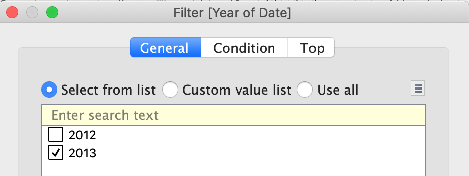 2) Now, to focus on 2013, drag Date to the filter shelf and select only 2013: