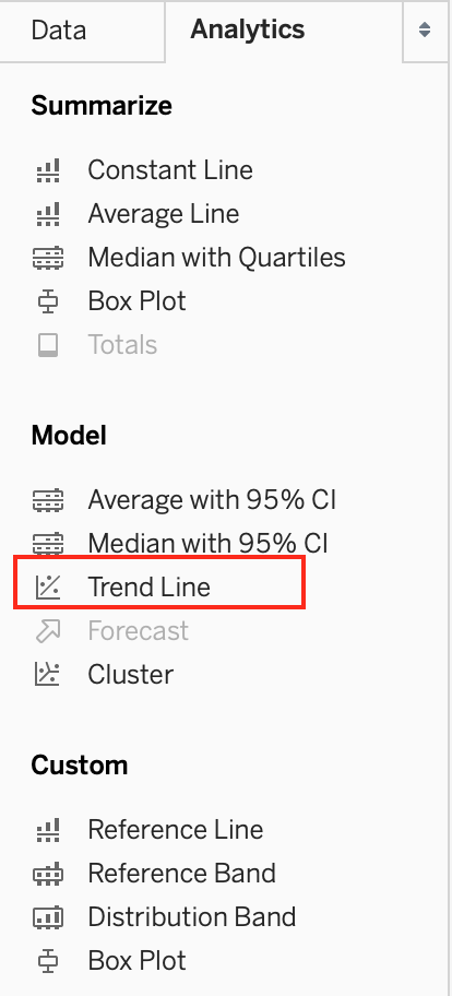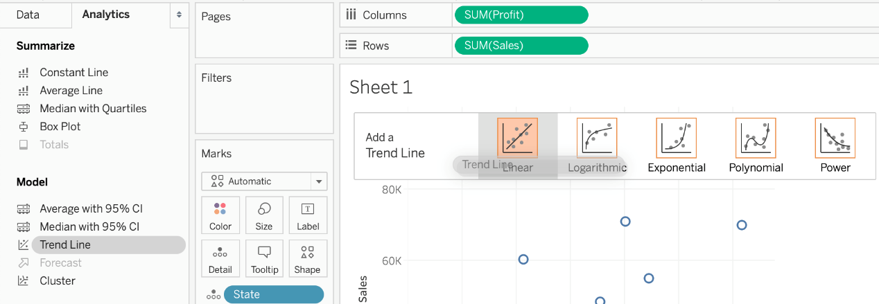3) Finally, move to the Analytics pane, and drag Trend line to the view. When you drag it, select the Linear option!: