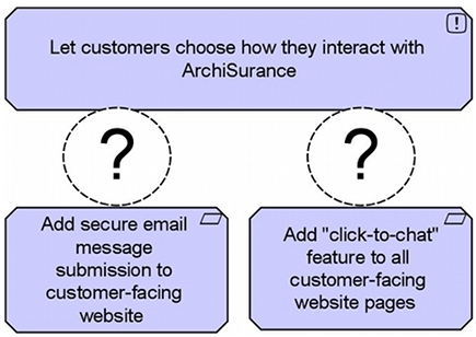 The following diagram uses ArchiMate Motivation Extension concepts. The concepts at the bottom of the diagram fulfill the concept at the top of the diagram.