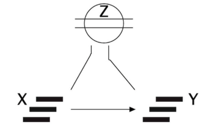 (A diagram showing two stacked horizontal bars labeled X and Y, connected by an arrow, and a circle with lines (Z) positioned between them.)