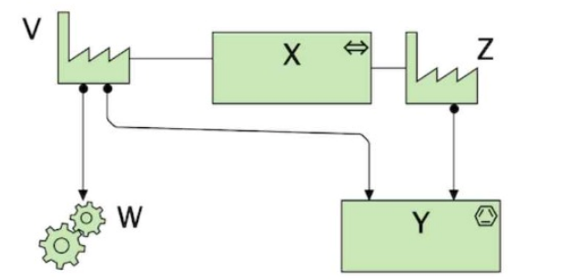 A. V = Production process, W = Finished Material, X = Transport network Incorrect
