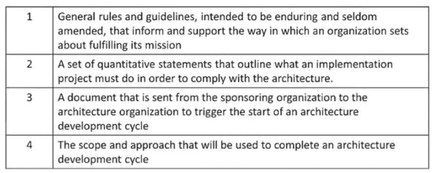 The Request for Architecture Work is a deliverable that is sent from the sponsor and triggers the start of an architecture development cycle. It defines the scope, budget, schedule, and deliverables for a specific architecture project. The Statement of Architecture Work is a deliverable that is produced by the architect and defines the approach and resources needed to complete an architecture project. It forms the basis of a contractual agreement between the sponsor and the architecture organization. The Architecture Principles are a deliverable that is produced by the architect and defines the general rules and guidelines for the architecture work. They reflect the business principles, business goals, and business drivers of the organization. The Architecture Requirements Specification is a deliverable that is produced by the architect and defines the requirements that govern the architecture work.It covers both functional and non-functional requirements as well as constraints and assumptions.