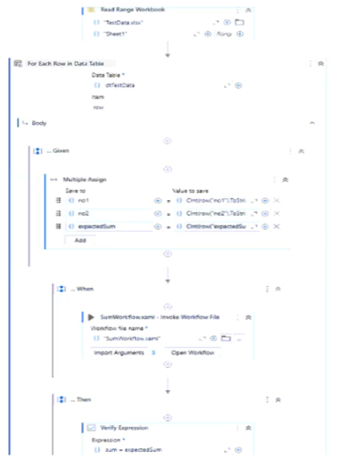 A developer, who has just discovered Test Suite, built a test case that checks if the SumWorkflow correctly performs the sum of 2 integers, using different input values from an Excel file.
