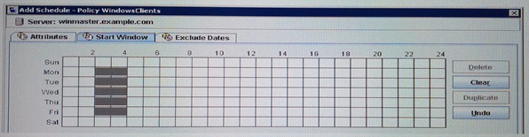 A backup policy uses a Full Backup schedule with a schedule type of Frequency: 1 days. The start window for the schedule is configured as shown in the exhibit: