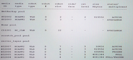 A backup job configured with a retention level of 2 and Policy volume pool set to the server_tapes is failing due to Status Code 96: Unable to allocate media for backup. See the output of the available_media command below: