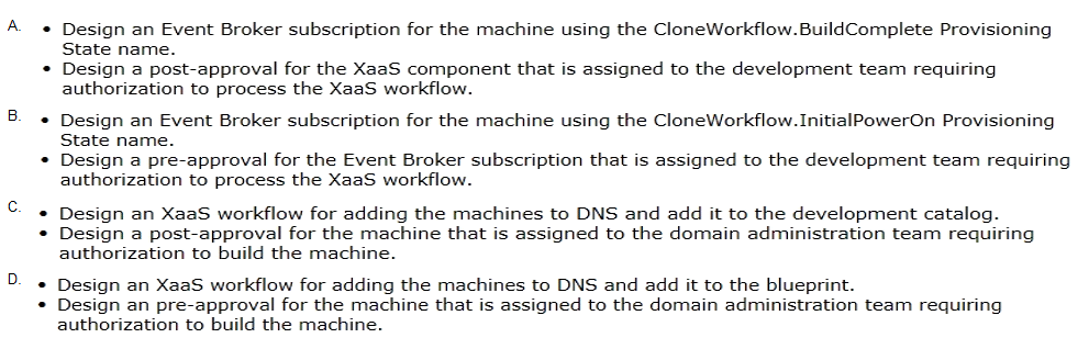 With minimal change to the catalog design, which two design options could the architect consider in order to enable users to begin deploying machines to both data centers? (Choose two.)