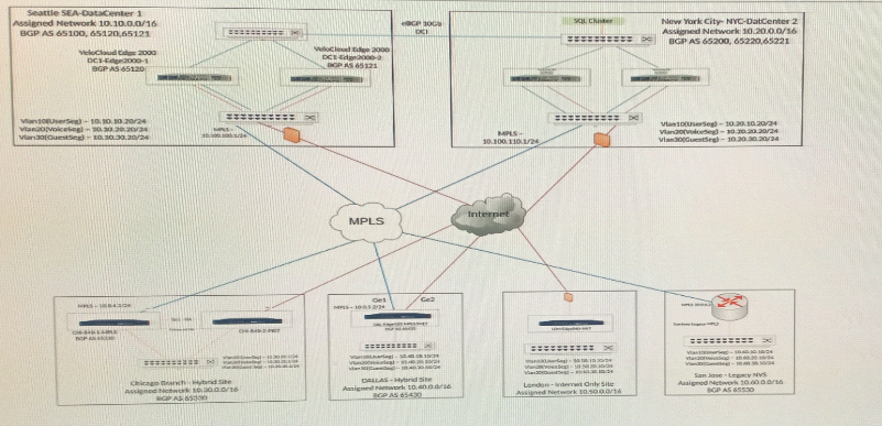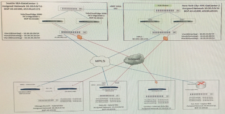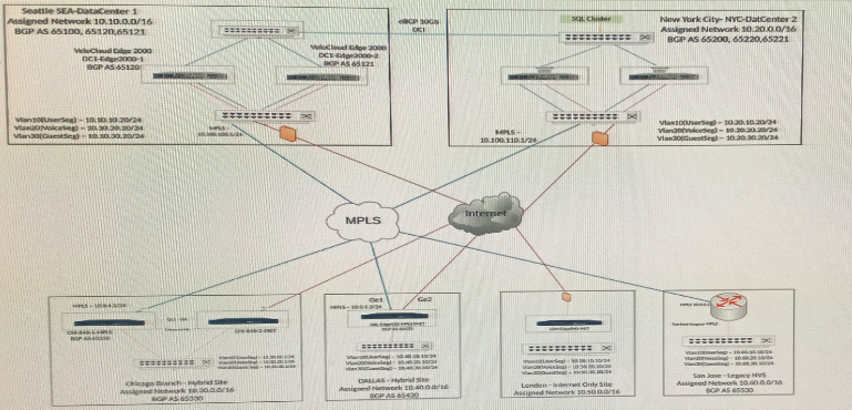 A network administrator is tasked with enabling SD-WAN at three branch locations. A topology has been provided for reference. For each site, the administrator is having issues bringing edges online, as another administrator has gone ahead and created a configuration ahead of lime. The organization has several branch sites. One is an Internet-only site and two are Hybrid locations with both internet and MPLS. The last location is MPLS only. There are hub data center locations in this environment as well. Please refer to the topology.