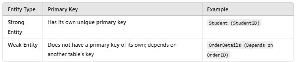 In database design, an entity is classified as strong or weak based on whether it has a primary key that uniquely identifies its records.