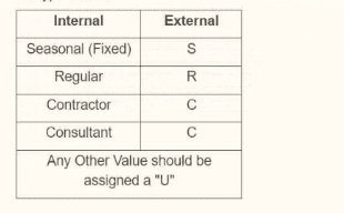 Map worker subtype values according to the provided table (e.g., Seasonal (Fixed) = 'S', Regular = 'R', Contractor = 'C', Consultant = 'C', and any other value = 'U').