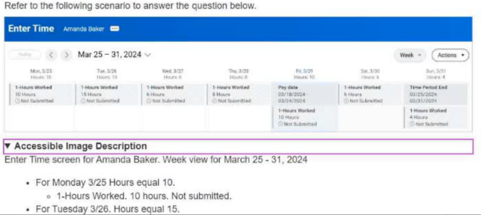 The correct answer is C. 3. On Tuesday, Amanda Baker reported 15 hours. Based on the rules provided, Workday Time Tracking would evaluate those 15 hours against the applicable daily and weekly thresholds. The first 8 hours remain regular hours. Since she worked more than 8 hours in the day, the next block of hours qualifies for daily overtime. Because she also exceeded 12 hours in the same day, the hours above 12 qualify for daily double time.