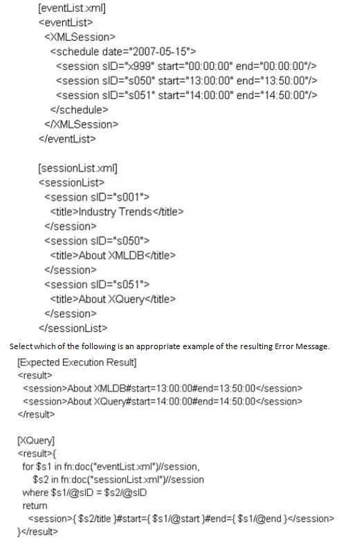 An [XQuery] was executed to join [eventList.xml] and [sessionUst.xml] (referenced in a separate window) and obtain the following [Expected Execution Result].
